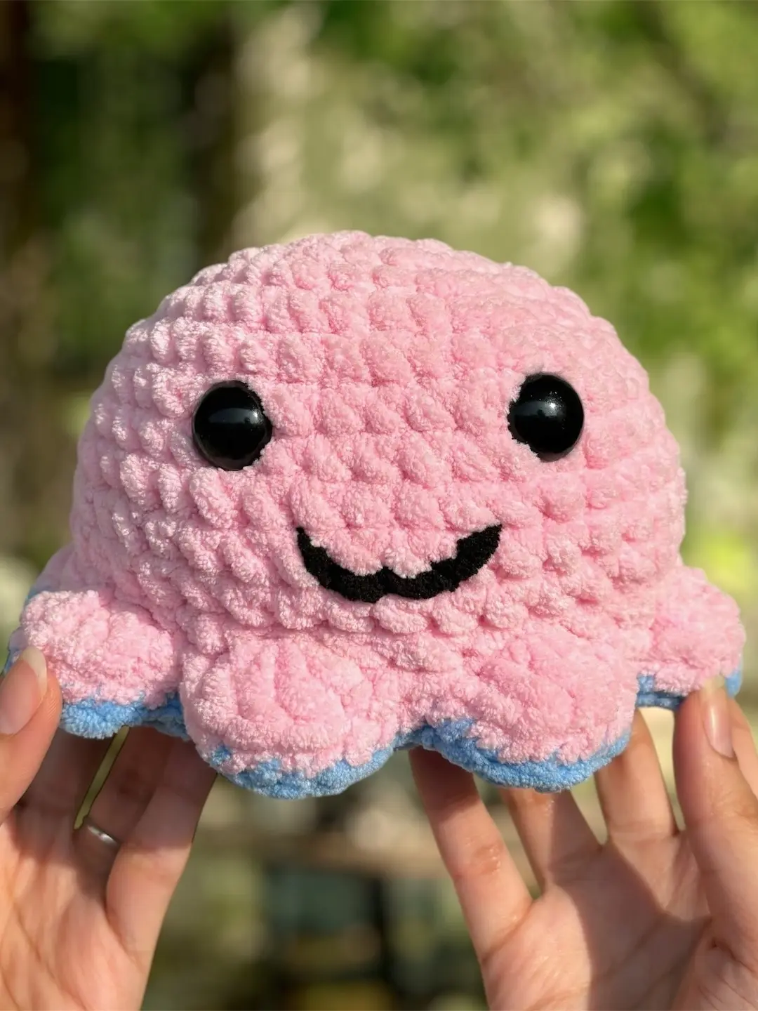 This cute octopus is made with a 5.5 mm crochet hook, chenille yarn in 2 different colors, black yarn or black sheet for the mouth, 15mm safety eyes, and some stuffing.