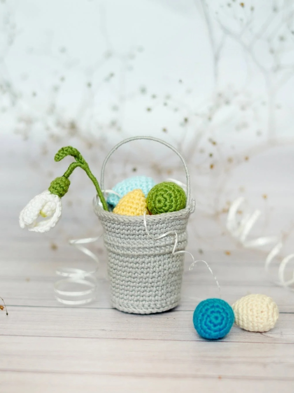 These instructions include how to make the bucket and its handle, eggs, snowdrop, and its leaf, stem, and also the pattern includes a photo tutorial for how to make each part included in the pattern.