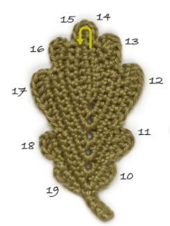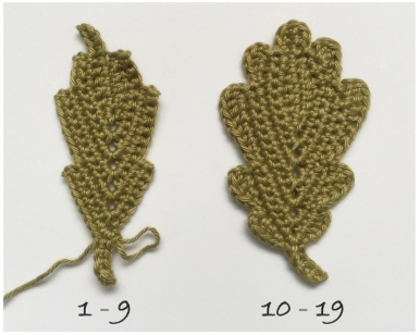 In steps 10-19, the curves are crocheted that give the typical shape of an oak leaf.