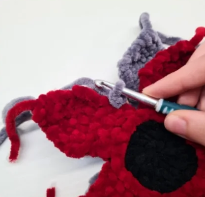 Insert the hook in the base of the red petal and in the specular st of the grey piece and ch 1 (this chain doesn’t count as a st), then make: